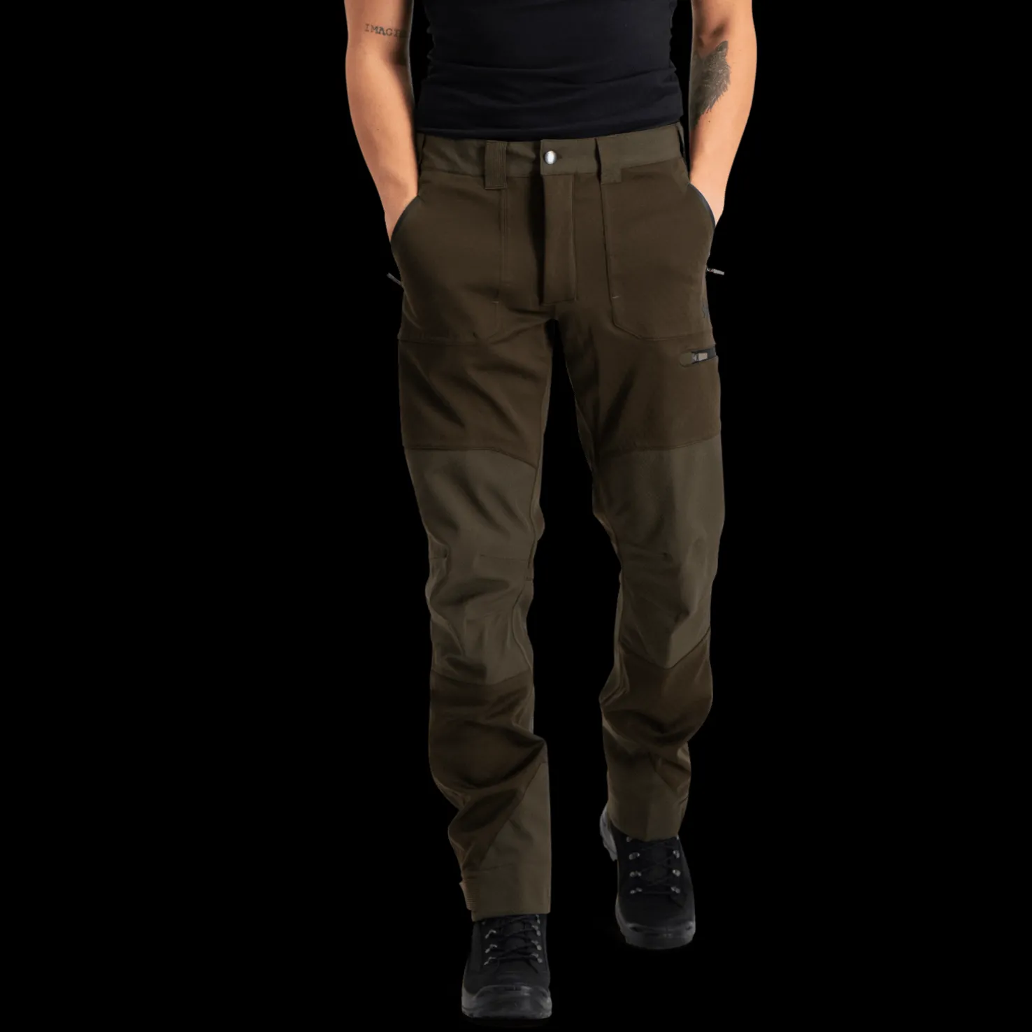 Housuissa on etutaskut ja tilava reisitasku, joissa kaikissa on vedenpitävä vetoketju. Metsästyshousuissa on vyötärönauhan vasemmalla puolella D-rengas, johon voit kiinnittää erilaisia varusteita.