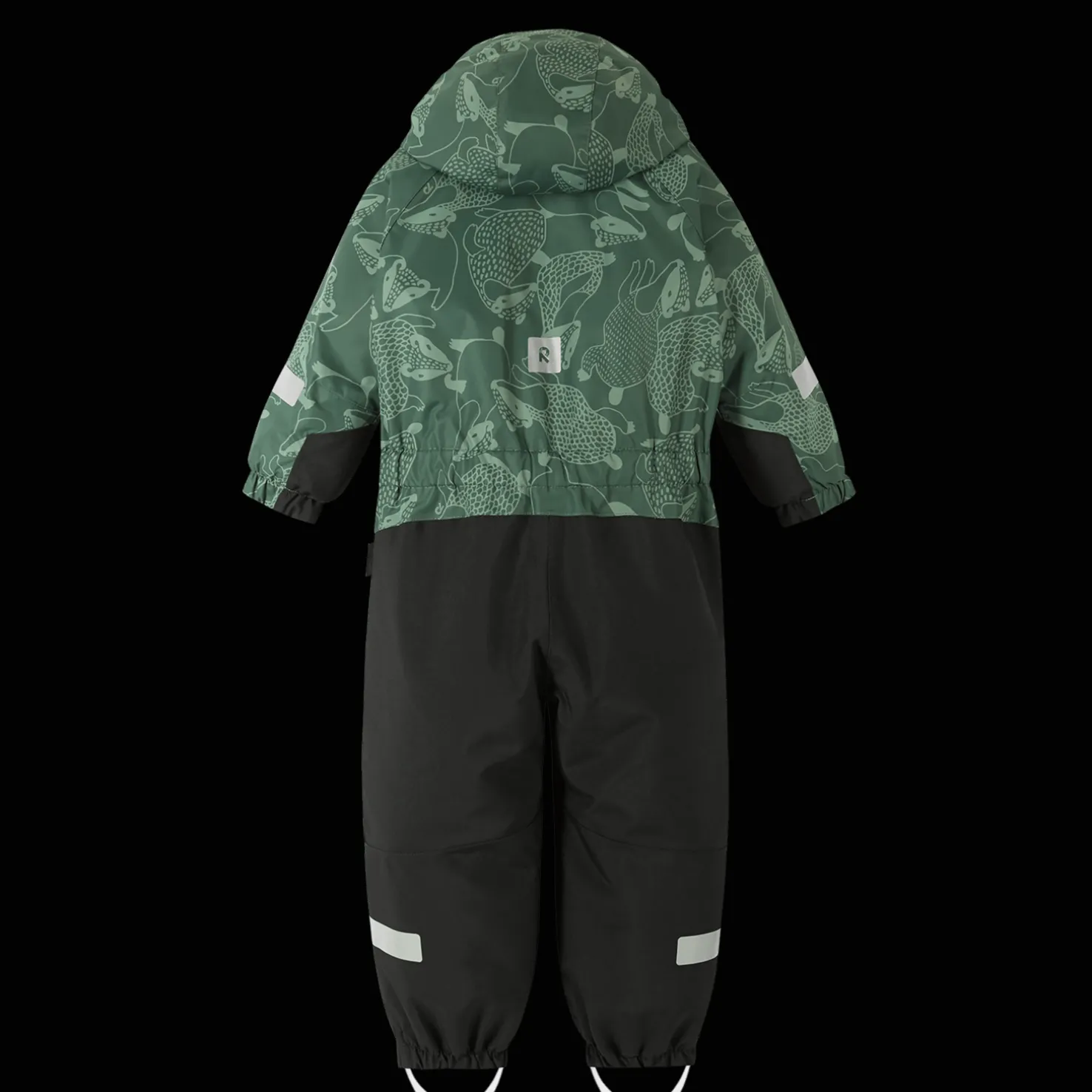 Huppu on irrotettava ja painonapit irtoavat helposti, jos se juuttuu johonkin. Irrotettavat silikoniset jalkalenkit, jotka on helppo kiinnittää kengän alle niin, että haalari pysyy paikallaan.